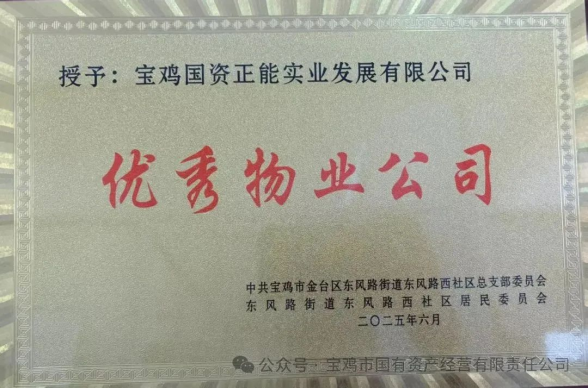 2025年上半年,宝鸡国资正能实业发展有限公司坚持以党建为引领,紧密配合社区工作,努力当好群众的“贴心管家”,不断提升服务质量,荣获多项属地表彰,展现了企业高度的社会责任感和卓越的服务水平。 烟厂项目获评“优秀物业公司” 近日,烟厂项目被东风路街道西社区评为“优秀物业公司”。这一荣誉的获得是对项目团队长期以来高标准、精细化服务的充分肯定。在公司领导的悉心指导和项目全体员工的共同努力下,烟厂项目始终以业主需求为核心,优化管理流程,提升服务品质,赢得了社区和业主的一致认可。未来,项目团队将继续保持优良作风,再接再厉,为业主创造更加安全、舒适、和谐的居住环境。