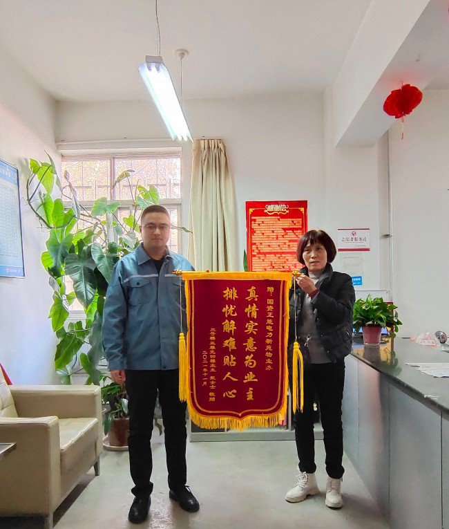 11月29日,家住电力新苑的戴女士将一面“真情实意为业主,排忧解难贴人心”的锦旗送到正能物业电力新苑物业办负责人张龙和他的团队手中,感谢物业人员用情用力、尽心尽责的贴心服务。