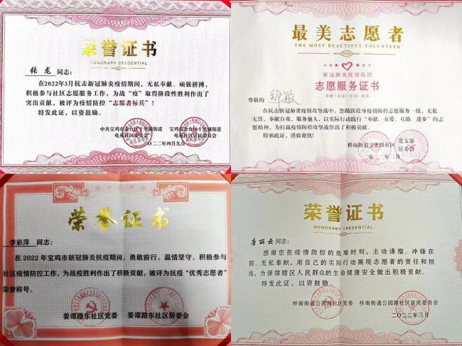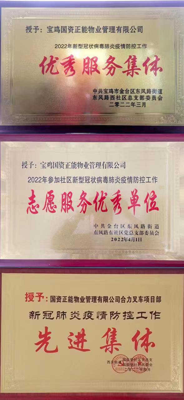 近期,各街办、社区对疫情防控工作中敢于担当、积极作为,在坚决打赢疫情防控阻击战工作中表现突出的物业企业和先进个人进行表彰,正能物业人用信念与坚守,获得了政府、社会和业主的认同和支持,其中,宝钢管、电力新苑、宝桥、中铁百赞居、一局五公司、一局三公司等20余个物业小区、10余名一线人员分别获得相关部门颁发的荣誉。