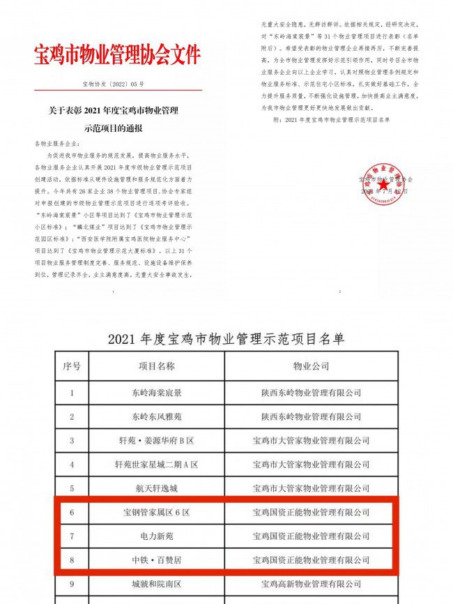 7月15日,宝鸡国资正能物业管理有限公司所属项目电力新苑、宝管六区、中铁百赞居通过包抓领导、片区与项目经理及项目全员半年多时间辛勤准备与全面提升,邀请物业行业专家验收组成员现场观摩、查看、指导,通过层层筛选,三个物业项目分别获得全市“2021年度宝鸡市物业管理示范项目称号”荣誉称号并获得奖牌。