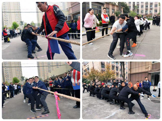 拔河比赛作为压轴项目,将全场气氛推向高潮。队员们紧握长绳,心往一处想,劲往一处使,每个人都在为团队的荣誉而拼尽全力。中场标志带的每一次移动都牵动着所有人的心弦,呐喊声、助威声此起彼伏,这不仅是力量的对抗,更是意志的比拼。